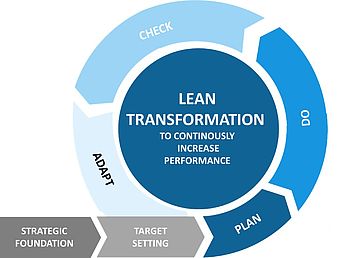 Wie kann eine Lean Transformation erfolgreich umgesetzt werden? Wir sehen einen dreiphasigen Ansatz: Phase eins: Stärkung der strategischen Grundlage, um sicherzustellen, dass die Lean-Maßnahmen die Unternehmensziele erfüllen, die Eigenverantwortung der Führungskräfte gelebt wird und die Dringlichkeit einer schlanken Transformation im gesamten Unternehmen klar kommuniziert wird. Wenn eine glaubwürdige Kommunikation fehlschlägt, besteht ein sehr hohes Risiko, dass die Aktivitäten der Lean-Transformation zu nichts führen. In Phase zwei, der Zielsetzung, wird die aktuelle Situation bewertet und die quantitativen Ziele nach einem Top-Down-Ansatz formuliert. Die Metriken für den Erfolg der Transformation müssen transparent und überprüfbar sein. In der dritten Phase erfolgt die eigentliche operative Entwicklung und Umsetzung der Lean-Management-Maßnahmen unter Verwendung der PDCA-Methode (Plan-Do-Check-Adapt) und Nominierung funktionsübergreifender Teams.